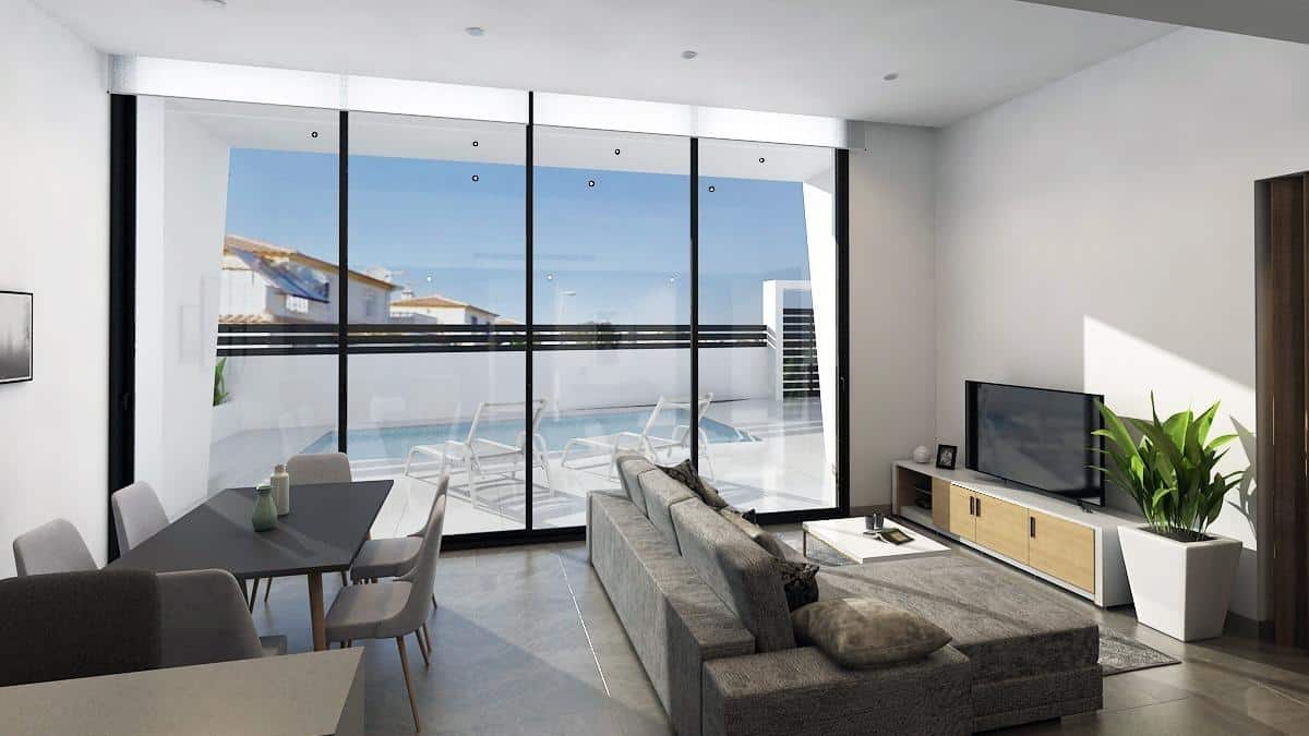 Preciosa villa de nueva construcción con piscina privada distribuido en 1 planta con 3 dormitorios, 2 baños, cocina americana con salón, terraza y solarium privado.